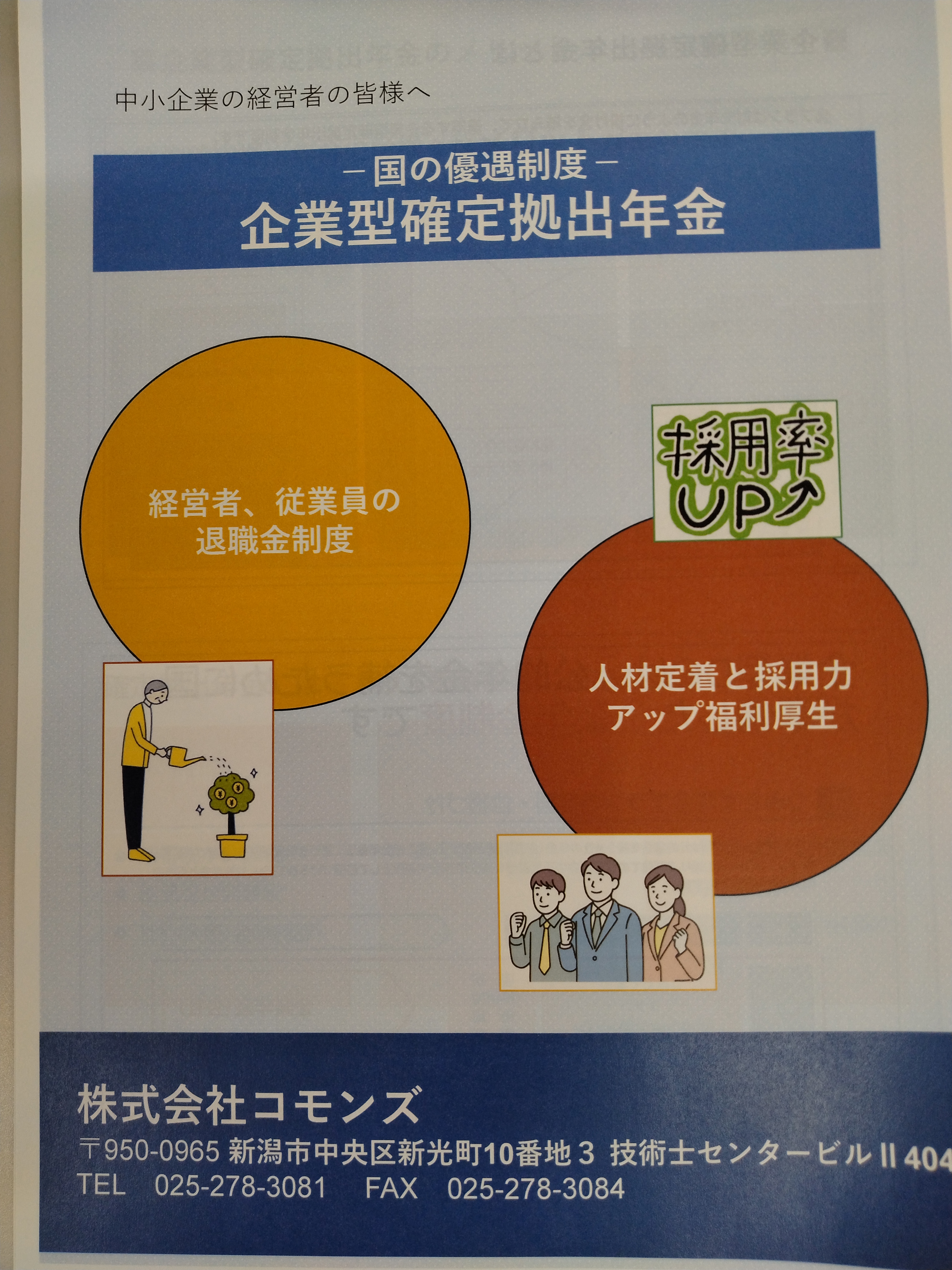 次回は6月13日15時より新潟市中央区新光町10番地2にある技術士センタービルⅠ 8階中会議室により「中小企業のための企業型DC(確定拠出年金)講座」を開催いたします。